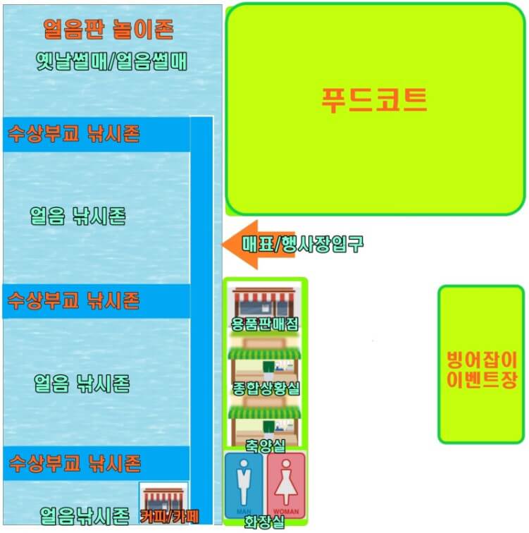 - 얼음판 위에서는 개인 텐트, 취사, 난로 사용을 절대 금지합니다. 단 배치도에 허용된 구간에서는 가능하오니 참고하시 바랍니다.